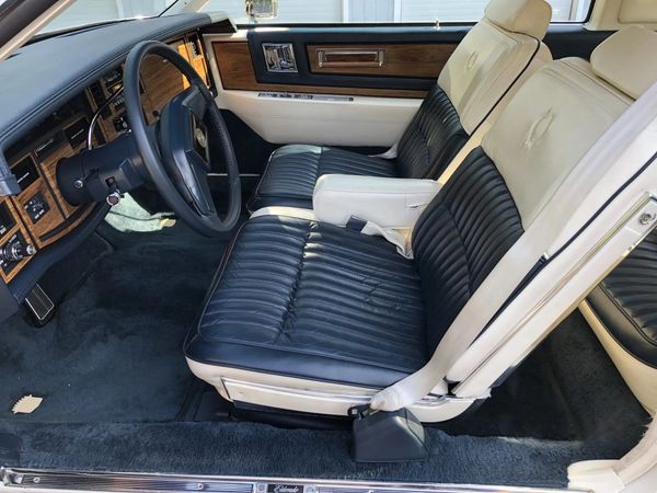 The defining feature of the 1985 Eldorado Commemorative Edition is this exclusive interior scheme. Unlike the standard production models which typically came in solid colors, the CE featured a unique Two-Tone Leathercombination. The seats are finished in White leather with contrasting Dark Blue (Commodore Blue) piping and trim. This plush, button-tufted "pillow style" design was specific to this limited run and is the primary indicator of a genuine Commemorative Edition.